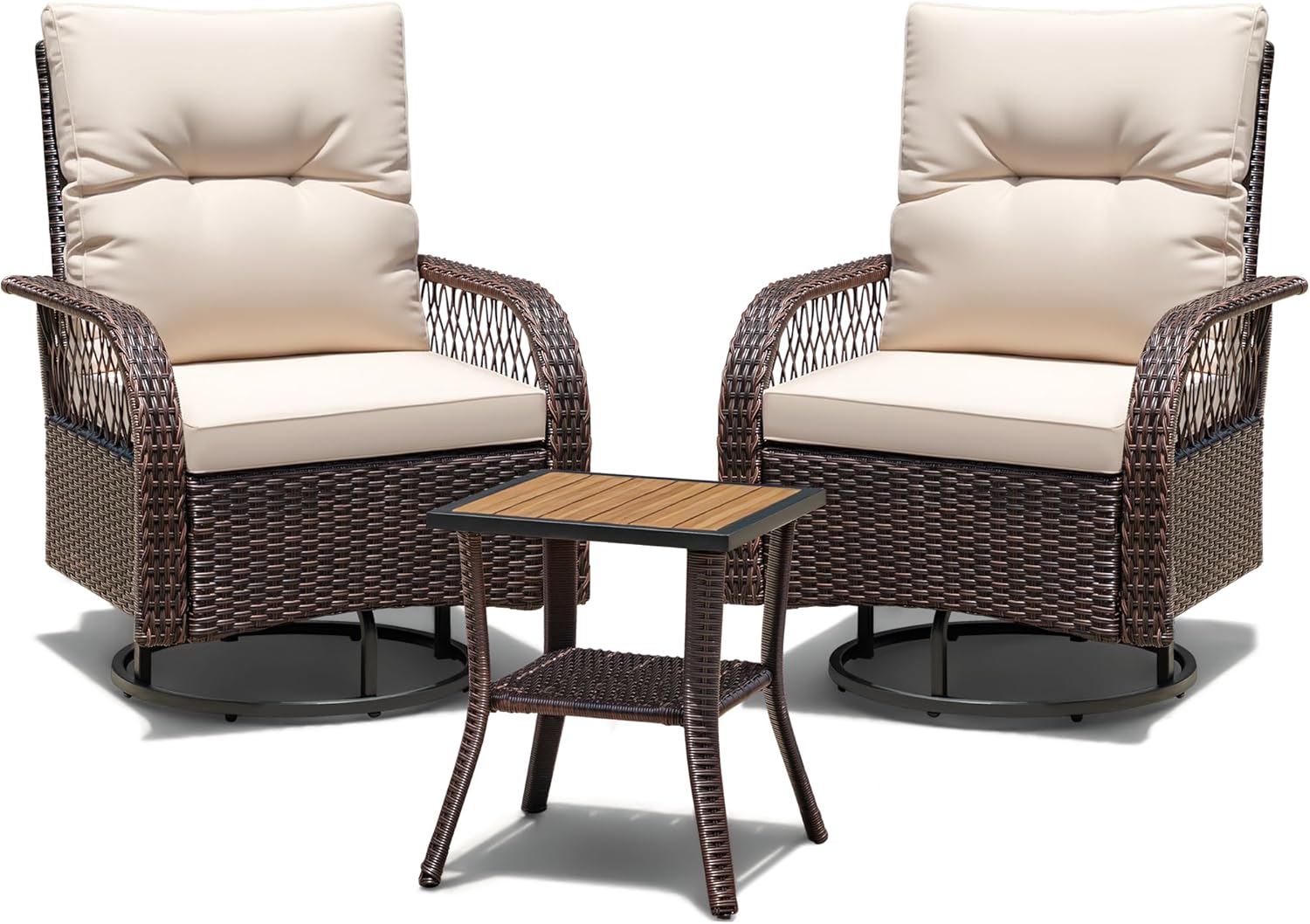 Devoko Patio Furniture Set Outdoor 3 Pieces Wicker Swivel Rocking Chairs Set of 2 with Coffee Table, Patio Conversation Set for Porch, Balcony, Deck, Garden (Brown)