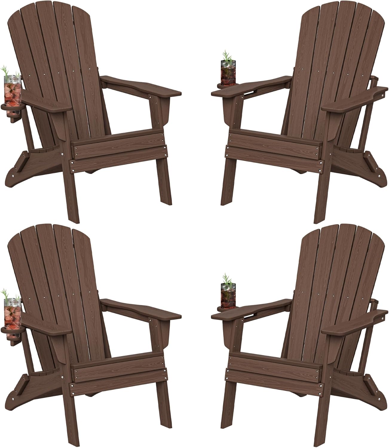 Plawdlik Folding Adirondack Chair Set of 4, Cup Holder,Wooden Textured ,Heavy All-Weather HDPE Comfortable Set Poolside Backyard Lawn Coffee